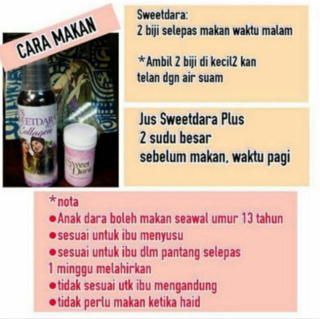 Tapi kenalah tahu pantang larang makan jamu. 2 sudu jus sweet dara setiap pagi malam JAMU JUS SWEET DARA - 2 biji jamu sweet dara pada waktu malam - 2 sudu jus sweet dara pada waktu pagi Ada kelulusan kkm. Macam mana cara makan.